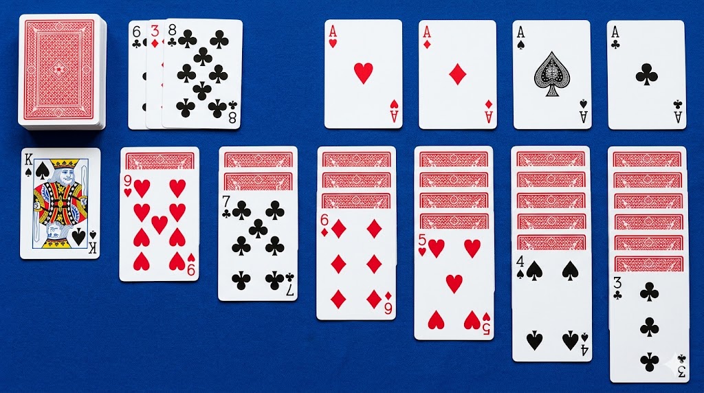Man lægger syv rækker kort: Den første har 1 kort, den anden 2, og så videre op til 7. Kun det øverste kort i hver række skal vende forsiden opad.